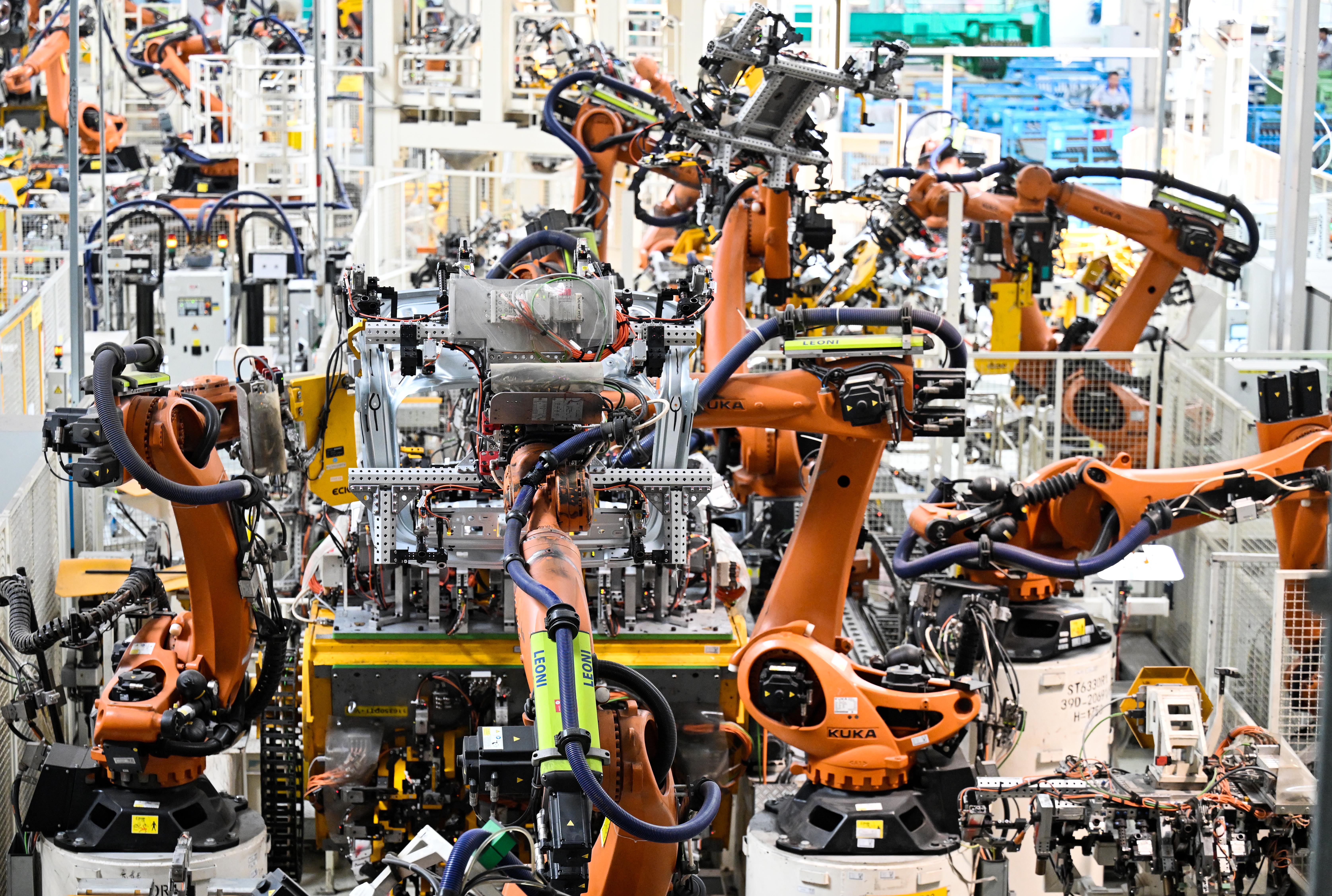7月7日,机械臂等自动化生产设备在天津经济技术开发区一汽-大众华北基地焊装车间作业。新华社记者赵子硕 摄